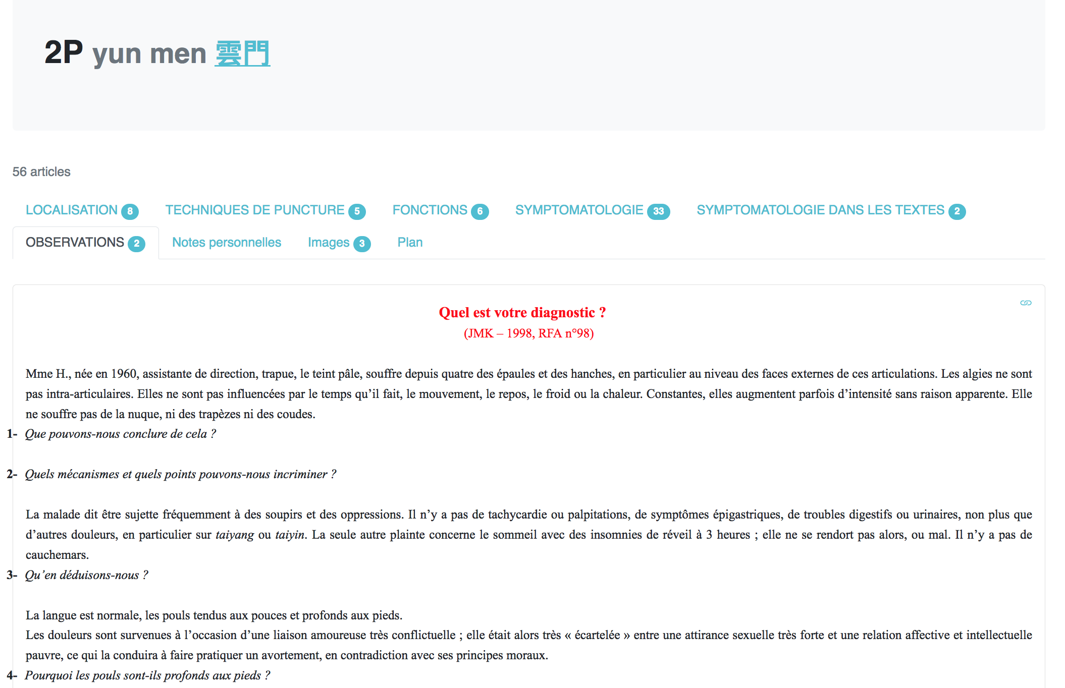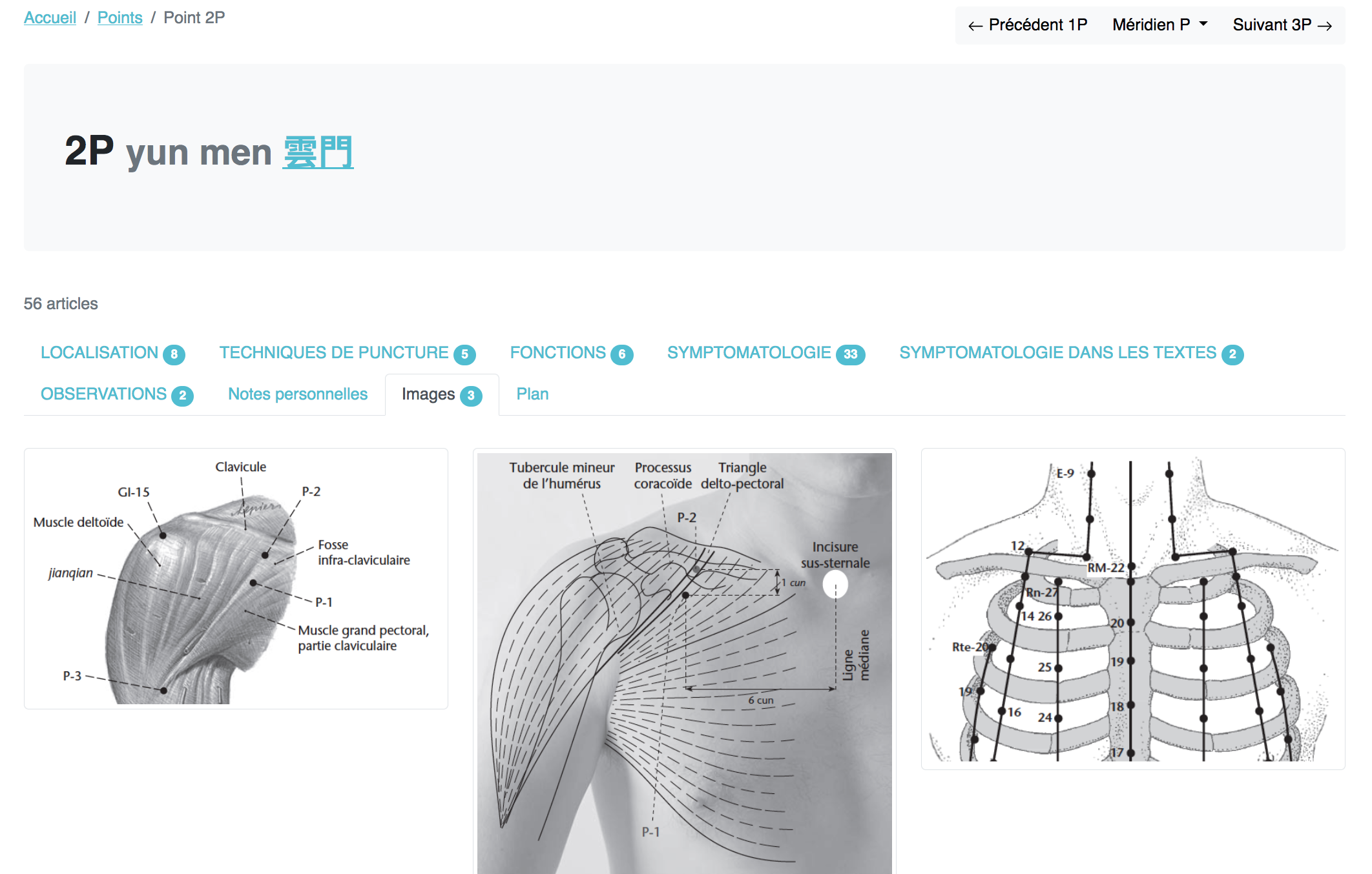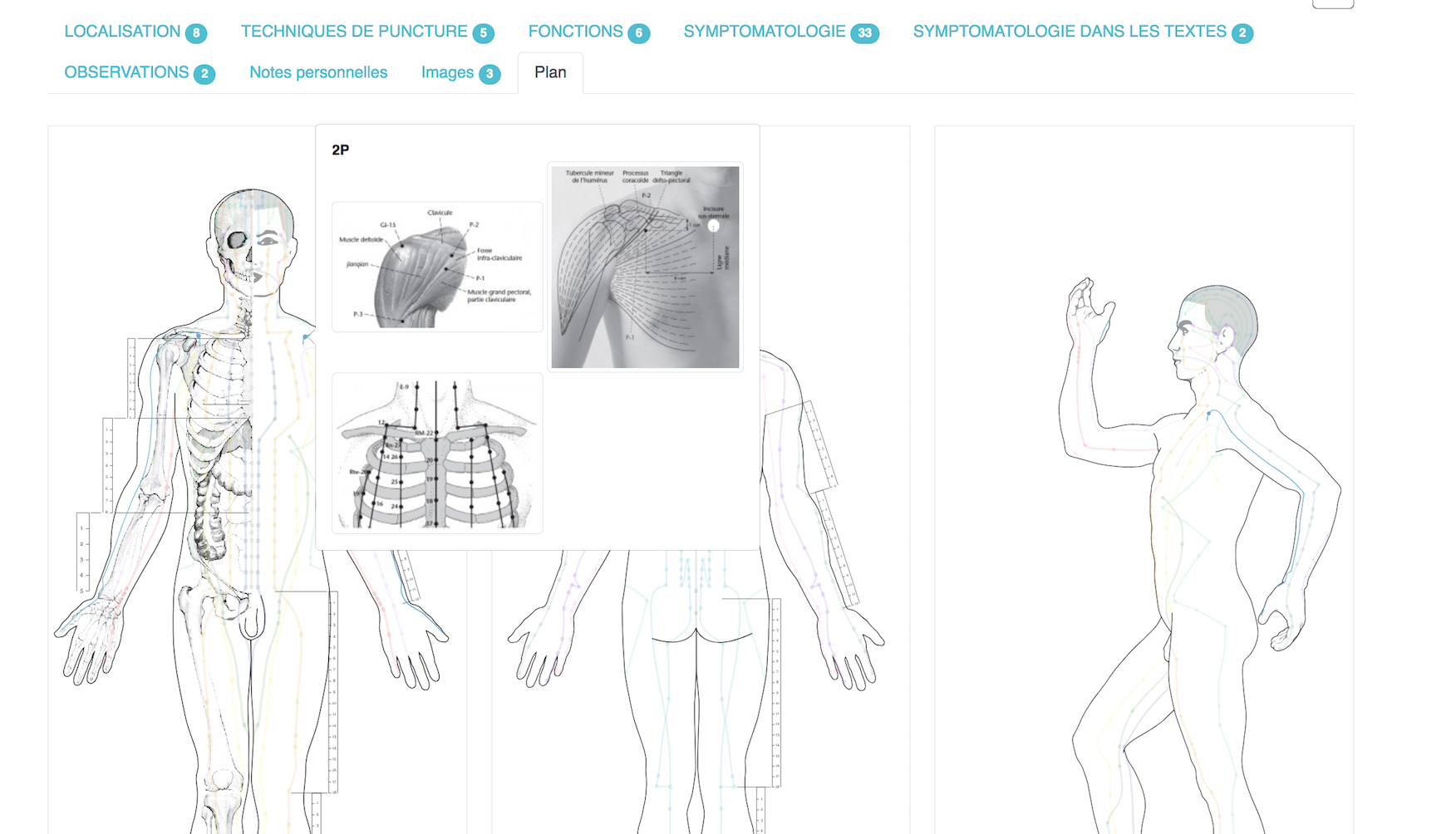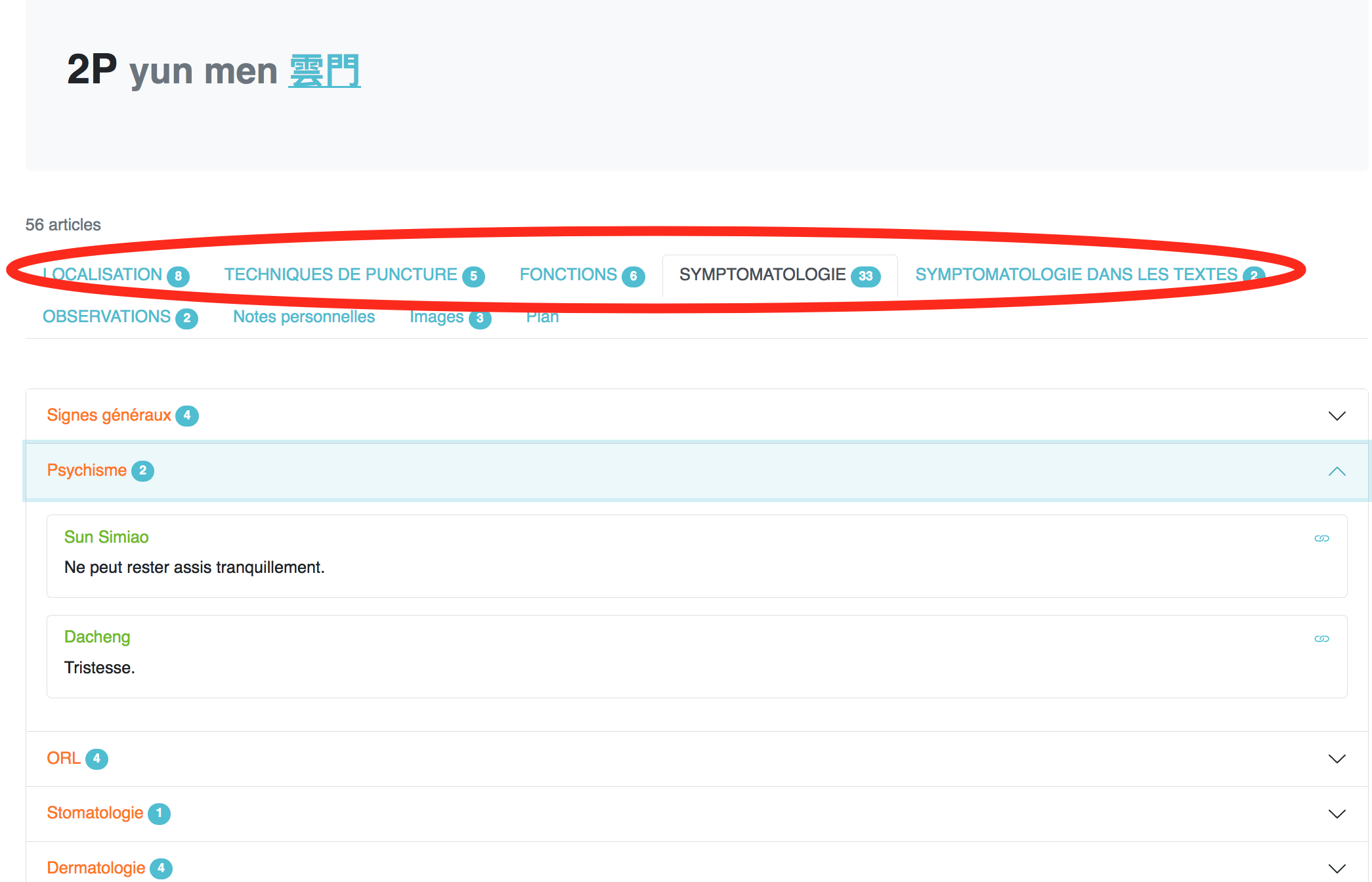 Chaque onglet vous permet l'accès au contenu sur les points en fonction des différents chapitres : LOCALISATION, TECHNIQUE DE PUNCTURE, FONCTIONS, SYMPTOMATOLOGIE, SYMPTOMATOLOGIE DANS LES TEXTES.
